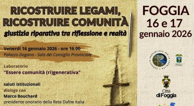 Foggia ospiterà la due giorni sul tema “Ricostruire legami, ricostruire comunità. Giustizia riparativa tra riflessione e realtà”, promossa dalla Consulta Provinciale per la Legalità