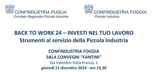 “BACK TO WORK 24 – INVESTI NEL TUO LAVORO”. Il seminario si pone l’obiettivo di accompagnare le Piccole Imprese nella ricerca di competenze qualificate, utili ad affrontare il mercato attuale, fornendo ad esse percorsi e soluzioni per accedere a risorse finanziarie necessarie a sostenere lo sviluppo. E ciò anche grazie alla disponibilità di manager, dirigenti e professionisti disposti ad investire capitali propri ed esperienza per diventare soci e partner delle aziende. Si parlerà inoltre di prospettive di internazionalizzazione, assicurazione sul credito, nonché opportunità per le imprese nella Regione Puglia. Il programma dei lavori prevede gli indirizzi di saluto di: Gianni Rotice, Presidente Confindustria Foggia; Vito Ruggieri Fazzi, Presidente Piccola Industria Confindustria Puglia; Maria Teresa Sassano, Presidente Piccola Industria Confindustria Foggia.  Seguiranno quindi gli interventi a cura di: Carlo Bassi,  Amministratore Delegato di BacktoWork24; Marco Castiglione, Responsabile Canale Partnership Euler Hermes Italia; Gioacchino Colonna, Consulente Finanziario di Confindustria Foggia.