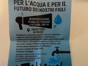 IL FUTURO. Nell'arco della mattinata di oggi, giovedì 2 ottobre, Antonio Tutolo ha operato un volantinaggio in centro a Foggia e spiegato le ragioni della manifestazione. Nella sua nota stampa, invece, Rosa Barone ha evidenziato come "La crisi idrica che sta colpendo la Puglia richiede interventi immediati. Per quello che riguarda la Capitanata, dove i nostri agricoltori sono ormai in ginocchio e sempre più persone hanno l'acqua solo nelle prime ore della mattina, servono chiare sia sulla condotta del Liscione che sulle altre opere previste per portare l'acqua. Ed è quello che vogliamo chiedere con la manifestazione di domani. Per questo invito tutti a partecipare, al di là dell’appartenenza politica. È in gioco il futuro della nostra provincia. Non possiamo restare a casa”.