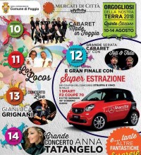 IL PROGRAMMA. Si parte venerdì 10 agosto con una serata di cabaret a cura dei comici locali di Made in Foggia, sabato 11 tocca ai Los Locos, domenica 12 spazio di nuovo alle risate con Antonio Stornaiolo ed Emilio Solfrizzi, noti anche come Toti e Tata. Lunedì 13 e martedì 14 ancora due concerti con Gianluca Grignani e Anna Tatangelo.