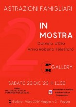 “Astrazioni Famigliari” è il titolo che riassume la mostra d'arte a due di Daniela d'Elia e Anna Roberta Telesforo che sarà inaugurata sabato 23 dicembre 2023 alle ore 11.30 presso la nuova PR Gallery a Foggia (in viale XXIV Maggio n. 3; visitabile tutti i giorni fino al 20 gennaio dalle 10.30 alle 12.30 e dalle 18 alle 20.00).