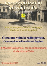 L’INCONTRO. Mercoledì 15 novembre 2017, alle ore 17.30, nella sezione Fondi Speciali della struttura di viale Michelangelo, il giornalista Michele Campanaro, con la collaborazione di Maurizio De Tullio - che all’interno della Biblioteca si occupa de “La Meravigliosa Capitanata”, l’archivio telematico su personaggi, eventi, luoghi e storia della Daunia -ripercorreranno le vicende delle prime radio private foggiane, nate nel 1976, anno della liberalizzazione dell’etere.