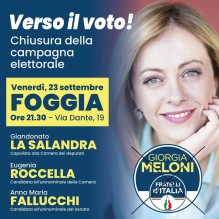 Con l'appuntamento in via Dante 19, sede del comitato elettorale, Fratelli d'Italia chiude la sua campagna elettorale a Foggia. L'incontro pubblico vedrà protagonisti Giandonato La Salandra, capolista alla Camera dei Deputati, Eugenia Roccella, candidata all'Uninominale della Camera e Anna Maria Fallucchi, candidata all'uninominale del Senato.