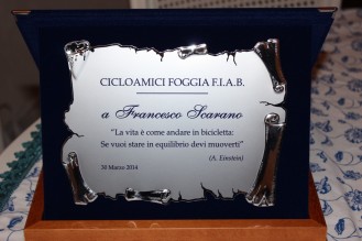 La scorsa settimana è venuto a mancare a Foggia, all'età di 101 anni, Francesco Scarano, pensionato dell'Istituto Poligrafico dello Stato e invalido di guerra. I membri dell'Associazione Cicloamici Foggia FIAB rivolgono a lui e alla sua famiglia un pensiero commosso, ricordando il suo grande attaccamento, nonostante la menomazione fisica, all'uso della bicicletta come mezzo di trasporto urbano. Ciò gli valse nel 2014 l'iscrizione all'Associazione come socio onorario e la consegna di una targa ricordo.