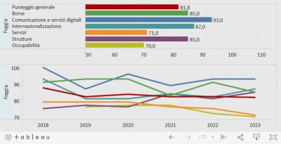 LA CLASSIFICA GENERALE. In merito alla graduatoria generale quest’anno l’Ateneo di Foggia vede migliorare la valutazione relativa alle strutture con un punteggio che varia da 81 dello scorso anno a 85 (qualità di aule, biblioteche, sale studio, laboratori). L’area nella quale si registra la migliore performance rispetto allo scorso anno è quella relativa all’internazionalizzazione (programmi di mobilità internazionale) passando da 82 dello scorso anno a 87 su 100, registrando il quarto miglior punteggio complessivo nella graduatoria nazionale e primo miglior punteggio per il Sud Italia. L’area relativa a comunicazione e i servizi digitali (qualità degli strumenti di comunicazione, siti web e canali social) conferma il risultato eccellente raggiunto lo scorso anno di 93 su 100.