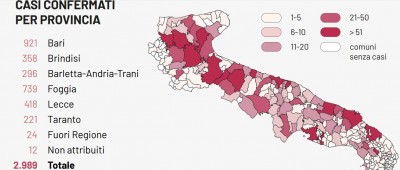 IL DATO COMPLESSIVO. Il totale dei casi positivi Covid in Puglia è di 2.989 così divisi: