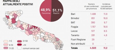 Il totale dei casi positivi Covid in Puglia è di 4.503 così divisi: