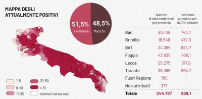 I DATI COMPLESSIVI. Dall'inizio dell'emergenza sono stati effettuati 2.354.067 test. 198.273 sono i pazienti guariti. 40.295 sono i casi attualmente positivi. Il totale dei casi positivi Covid in Puglia è di 244.787 così suddivisi: 93.105 nella Provincia di Bari; 24.365 nella Provincia di Bat; 18.549 nella Provincia di Brindisi; 43.935 nella Provincia di Foggia; 25.275 nella Provincia di Lecce; 38.396 nella Provincia di Taranto; 785 attribuiti a residenti fuori regione; 377 provincia di residenza non nota.