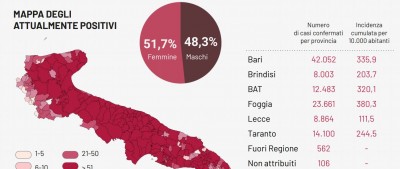 Il totale dei casi positivi Covid in Puglia è di 109.831, così suddivisi: