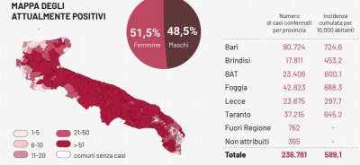 Il totale dei casi positivi Covid in Puglia è di 236.781 così suddivisi: