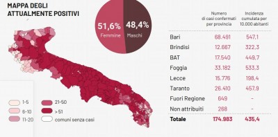 Il totale dei casi positivi Covid in Puglia è di 174.983, così suddivisi: