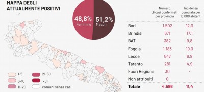 Il totale dei casi positivi Covid in Puglia è di 4596 così suddivisi: