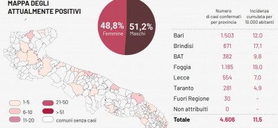 Il totale dei casi positivi Covid in Puglia è di 4606 così suddivisi: