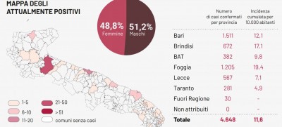 Il totale dei casi positivi Covid in Puglia è di 4648 così suddivisi: