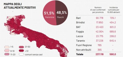 Il totale dei casi positivi Covid in Puglia è di 237.116 così suddivisi: