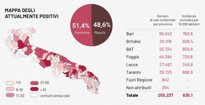 Il totale dei casi positivi Covid in Puglia è di 255.237 così suddivisi: