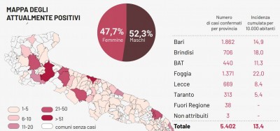 Il totale dei casi positivi Covid in Puglia è di 5.402, così suddivisi: