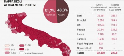 Il totale dei casi positivi Covid in Puglia è di 92.359, così suddivisi:
