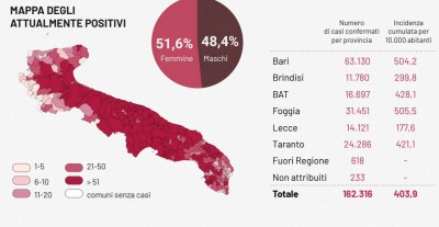 Il totale dei casi positivi Covid in Puglia è di 162.316 così suddivisi: