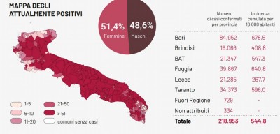 Il totale dei casi positivi Covid in Puglia è di 218.953 così suddivisi: