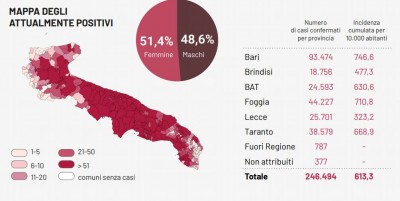 Il totale dei casi positivi Covid in Puglia è di 246.494 così suddivisi: