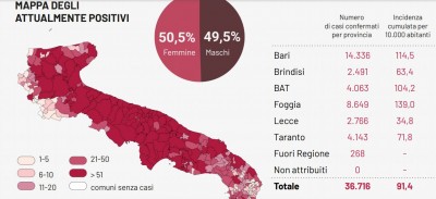 I DATI COMPLESSIVI. Dall'inizio dell'emergenza sono stati effettuati 665.959 test. 9.052 sono i pazienti guariti. 26.607 sono i casi attualmente positivi. Il totale dei casi positivi Covid in Puglia è di 36.716 così suddivisi: 14.336 nella Provincia di Bari; 4.063 nella Provincia di Bat; 2.491 nella Provincia di Brindisi; 8.649 nella Provincia di Foggia; 2.766 nella Provincia di Lecce; 4.143 nella Provincia di Taranto; 268 attribuiti a residenti fuori regione.