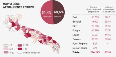 Il totale dei casi positivi Covid in Puglia è di 254.243, così suddivisi: