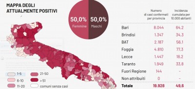Il totale dei casi positivi Covid in Puglia è di 19.928, così suddivisi: