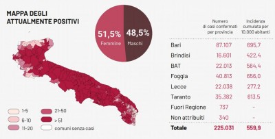Il totale dei casi positivi Covid in Puglia è di 225.031 così suddivisi: