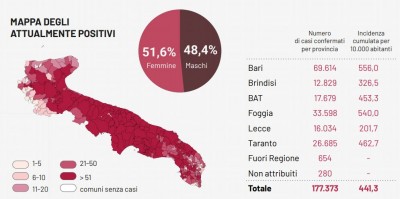 Il totale dei casi positivi Covid in Puglia è di 177.373 così suddivisi: