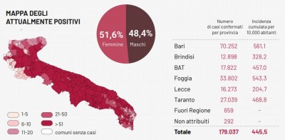 I DATI COMPLESSIVI. Dall'inizio dell'emergenza sono stati effettuati 1.781.850 test. 130.912 sono i pazienti guariti. 43.594 sono i casi attualmente positivi. Il totale dei casi positivi Covid in Puglia è di 179.037 così suddivisi: 70.252 nella Provincia di Bari; 17.822 nella Provincia di Bat; 12.898 nella Provincia di Brindisi; 33.802 nella Provincia di Foggia; 16.273 nella Provincia di Lecce; 27.039 nella Provincia di Taranto; 659 attribuiti a residenti fuori regione; 292 provincia di residenza non nota.