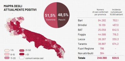 Il totale dei casi positivi Covid in Puglia è di 249.380 così suddivisi: