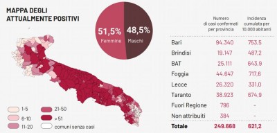 Il totale dei casi positivi Covid in Puglia è di 249.668 così suddivisi: