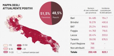 Il totale dei casi positivi Covid in Puglia è di 250.419 così suddivisi: