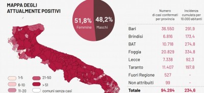 Il totale dei casi positivi Covid in Puglia è di 94.284, così suddivisi: