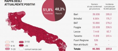 Il totale dei casi positivi Covid in Puglia è di 95365, così suddivisi: