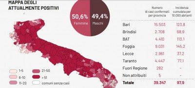 Il totale dei casi positivi Covid in Puglia è di 39.347, così suddivisi:
