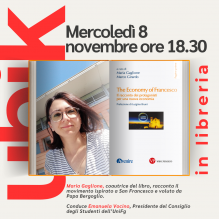 DAL MOVIMENTO AL LIBRO. È “The Economy of Francesco”, di cui si parlerà mercoledì 8 novembre, alle ore 18.30, negli spazi della Ubik di Foggia. A presentarlo sarà la biotecnologa Maria Gaglione coautrice, insieme con il giornalista di “Avvenire” Marco Girardo, del testo che prende il titolo del movimento creato da Bergoglio, teso a rivoluzionare i paradigmi dell’economia. Dialoga con l’autrice, la Presidente del Consiglio degli Studenti dell’Università di Foggia, Emanuela Vocino. L’incontro è organizzato insieme con la Cappella Universitaria di Foggia diretta da Don Bruno D’Emilio.