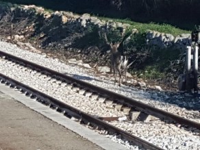 Un giovane esemplare maschio di daino in giro lungo i binari della stazione di San Nicandro delle Ferrovie del Gargano.
