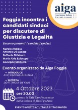 “Foggia incontra i candidati sindaci per discutere di Giustizia e Legalità”: questo è il titolo dell’evento che AIGA (Associazione Italiana Giovani Avvocati) Sezione di Foggia ha organizzato per il 4 ottobre, ore 20.00, presso la sala San Francesco della Chiesa di Gesù e Maria.