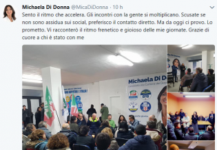 Un tweet, corredato da immagini dell’ultimo incontro pre –elettorale, con un messaggio diretto a ‘follower’ e internauti. Perché la campagna elettorale si fa anche online e Michaela Di Donna ha capito di aver tralasciato, finora, l’aspetto social. Da qui, il tweet che la candidata di Forza Italia ha scritto per sintetizzare la prima parte della sua campagna elettorale: “Sento il ritmo che accelera. Gli incontri con la gente si moltiplicano. Scusate se non sono stata asssidua sui social, preferisco il contatto diretto. Ma da oggi ci provo. Lo prometto. Vi racconterò il ritmo frenetico e gioioso delle mie giornate. Grazie di cuore”.