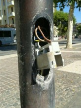 Piazza Italia, un palo della luce "sventrato" nella zona inferiore, con la cassetta dei contatti e annessi fili elettrici in bella vista: pericoloso per la pubblica incolumità specie nelle ore serali in cui la centralissima piazza foggiana pullula di ragazzi che affollano la movida notturna.
