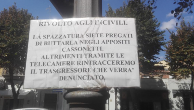 Un cartello "rivolto agli incivili". E' quello comparso in corso Giannone a Foggia, contro chi non abbandona correttamente i rifiuti. Con tanto di 'avvertimento'. "La spazzatura siete pregati di buttarla negli appositi cassonetti. Altrimenti - si legge sul cartello - tramite le telecamere rintracceremo il trasgressore che verrà denunciato".