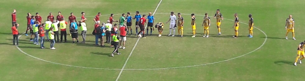 FINALE DI PRIMO TEMPO INCANDESCENTE. Poco prima della mezzora attimi di panico sugli spalti. Viscomi si scontra con il portiere Loliva e resta steso a terra. I soccorsi arrivano in ritardo tra le proteste del pubblico ma poco dopo il difensore rossonero si rialza tra gli applausi. Mister Corda per precauzione preferisce sostituirlo con Anelli. Pochi minuti ed è proprio l'esperto difensore che dimezza lo svantaggio. Punizione battuta da Cittadino, spizzata di testa di Tortori e conclusione vincente di Anelli che batte Loliva e corre ad abbracciare il tecnico. Il Gravina non ci sta e al 41' riallunga le distanze. Ancora Santoro in contropiede si sistema il pallone sul destro in area e trafigge Fumagalli con un preciso diagonale. La reazione dei rossoneri c'è ma sbatte contro la traversa colpita da Cittadino su punizione e sui guanti di Loliva che, proprio prima del duplice fischio dell'arbitro compie un miracolo su Russo.