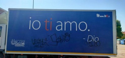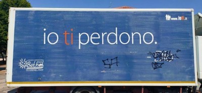 Chissà se quel "Io ti perdono" lo dedicheranno proprio agli ignoti che hanno agito nella notte. Perchè l'ente di beneficenza Bethel si è risvegliato con l'amaro in bocca: il camion parcheggiato a Foggia, in via Tito Serra 10 (nei pressi della Provincia 'nuova') - usato per il trasporto di alimenti e cose - sui due lati ha delle scritte molto belle, purtroppo imbrattate da ignoti.