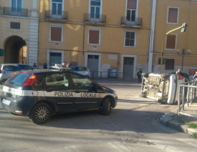 Incidente questa mattina all’incrocio tra via della Repubblica e via San Lazzaro, proprio davanti ai Tre archi, in pieno centro a Foggia. L’impatto è avvenuto tra una Hiunday e una Madza: sicuramente – ricostruiscono gli agenti della Polizia locale – una delle due vetture non si è fermata, rispettando il semaforo rosso e un’auto si è ribaltata sul fianco. Entrambi i conducenti sono stati trasportati in ospedale e non si conoscono le condizioni. Sul poso la Polizia locale e una ambulanza del 118.