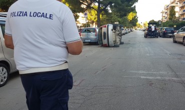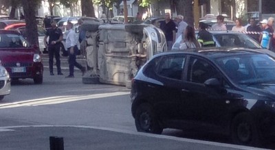Incidente in Via Telesforo: una Citroen C3 arriva ad alta velocità, coinvolge altre tre auto e si ribalta