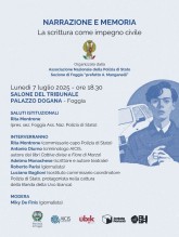 Narrazione e Memoria - La scrittura come impegno civile”, questo il filo conduttore di un incontro, promosso dalla Sezione ANPS, che si terrà il 7 luglio 2025 alle ore 19:00 (ingresso nella Sala del Tribunale alle ore 18:30), presso Palazzo Dogana (piazza XX Settembre), a Foggia.