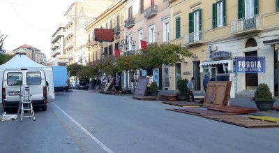 Lavori in corso in piazza Cavour e in via Lanza per dare vita alla “Fiera di Natale” e agli altri addobbi previsti dal Comune di Foggia.