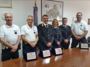 I RICONOSCIMENTI. Alla presenza dell'assessore alla Polizia Locale, Claudio Amorese e del Comandante del Corpo, Romeo Delle Noci, il presidente della Pro Loco ha consegnato una targa di benemerenza al Commissario Capo, Domenico Simone, ai Vice Sovrintendenti Stefano Berardino, Vito Solimine e Giuseppe Di Ruberto per aver svolto le indagini che hanno portato alla denuncia di due minori rei di aver vandalizzato gli arredi urbani di Piazza Purgatorio.